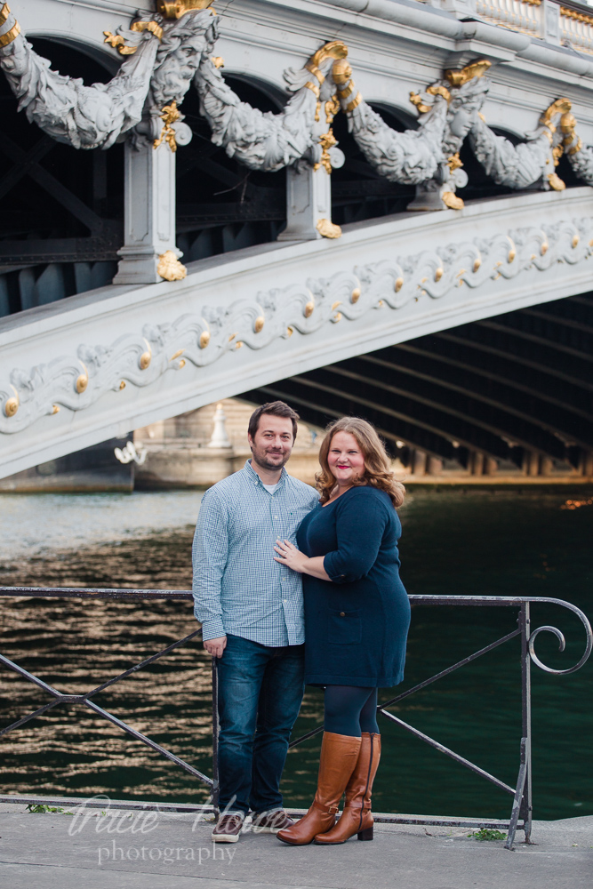 R: The architecture and the light! It was the perfect spot to show off Paris. As a tour guide in Paris, I spend a lot of time in the Eiffel Tower and other monuments, so I was really happy that Tracie chose a spot that is a little less cliché Paris, but still perfectly represents the city where Xavier met and fell in love. The Alexandre III bridge and that area were perfect because we could see the Eiffel Tower in the background, but it wasn’t the primary focus. With this location, we also see the details of the bridge, the arches and sculptures. And I love the way she took advantage of the beautiful symmetry of the trees.